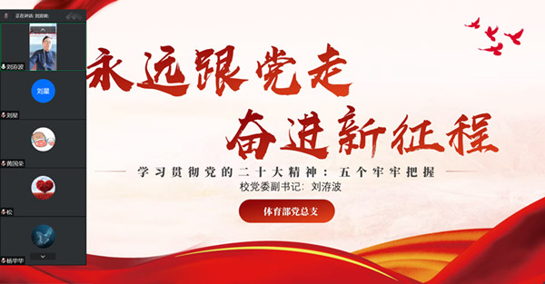 12月9日下午,学校党委副书记、副校长刘洊波通过线上形式为体育部宣讲党的二十大精神。体育部党总支书记杨效勇及体育部全体党员、入党积极分子参加学习。