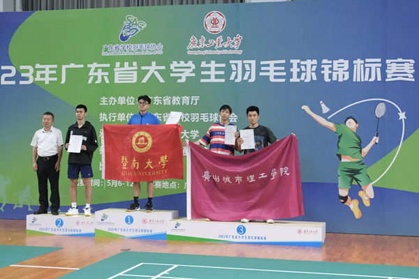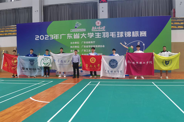 5月5日-9日,由广东省省教育厅主办、广东省学校羽毛球协会承办的2023年广东省大学生羽毛球锦标赛在广东工业大学(揭阳校区)举行。我校羽毛球队教练员梁松、傅文涛带领麦鹤鹏等10名运动员参赛。经过5天的一路过关斩将,我校运动员麦鹤鹏与朱健民分别夺得男子单打第三名、我校代表队荣获团体总分一等奖、梁松和傅文涛获评优秀教练员。