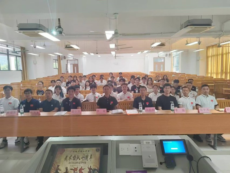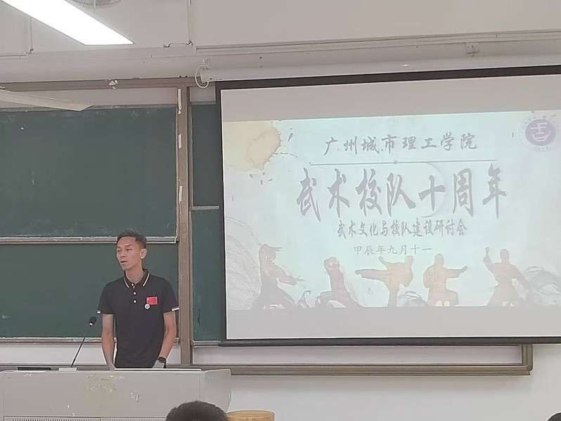 本网讯(记者 汤俊昊)10月13日下午,武术队成立十周年庆典暨武术文化与校队建设研讨会在A5教学楼201教室隆重举行。本次庆典由学校体育部与武术校队联合主办,武术协会承办,会议邀请了广东培正学院、广州工商学院、广东铁路职业技术学院等高校武术方面专家学者参会,吸引了来自校内外的50余名学生武术爱好者与共同参与。