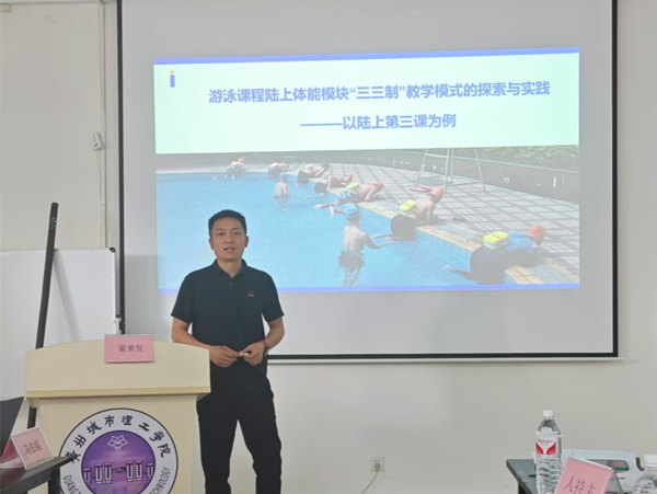 紧接着,综合教研室梁荣发主任带来《游泳》课程展示。他以陆上第三课为典型案例,详细且全面地介绍游泳课程框架,系统阐释了三三制教学体系的创新实践。在身体素质练习中,融入立定跳远接力赛、袋鼠跳接力赛、猜拳耐力跑等游戏,将耐力训练巧妙转化为趣味十足的团队协作游戏,既能激发学生的运动热情,又能实现体能提升与运动防护的双重目标。梁荣发主任的教学演示为教学创新开拓了新视野,让教师们对教学模式的革新有了更深刻的思考。