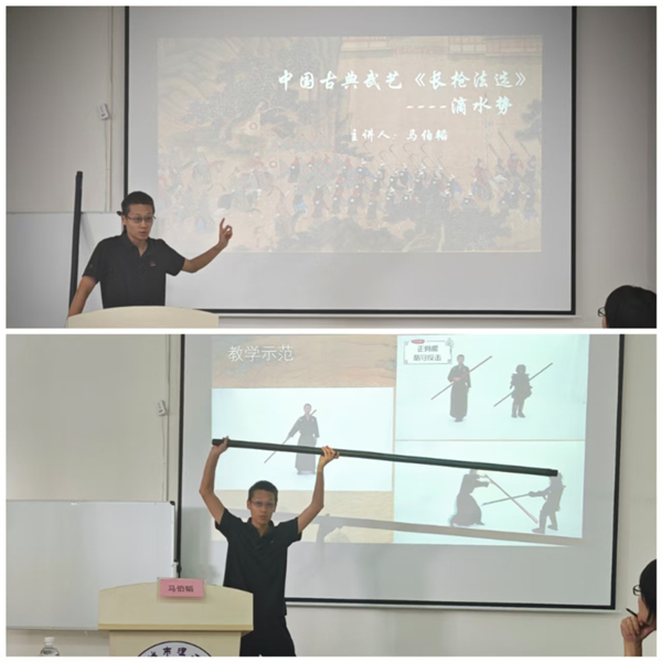活动伊始,岳艳丽简要介绍了本次活动的主题与流程,为后续环节拉开序幕。马伯韬副教授率先进行《武术》教学展示,课程设计紧扣三维目标,运用讲-演-练-评四步教学法,将武术长兵中极具攻防智慧的滴水势防守技术分解呈现。他通过动态教学展示构建技术认知,随后亲身示范完整动作流程;通过正误动作对比视频的解析,将武术教学的专业性与直观性充分融合。值得一提的是,学生通过手写反思笔记或微信群即时交流的形式,细致记录课后的真实感受与深度思考。